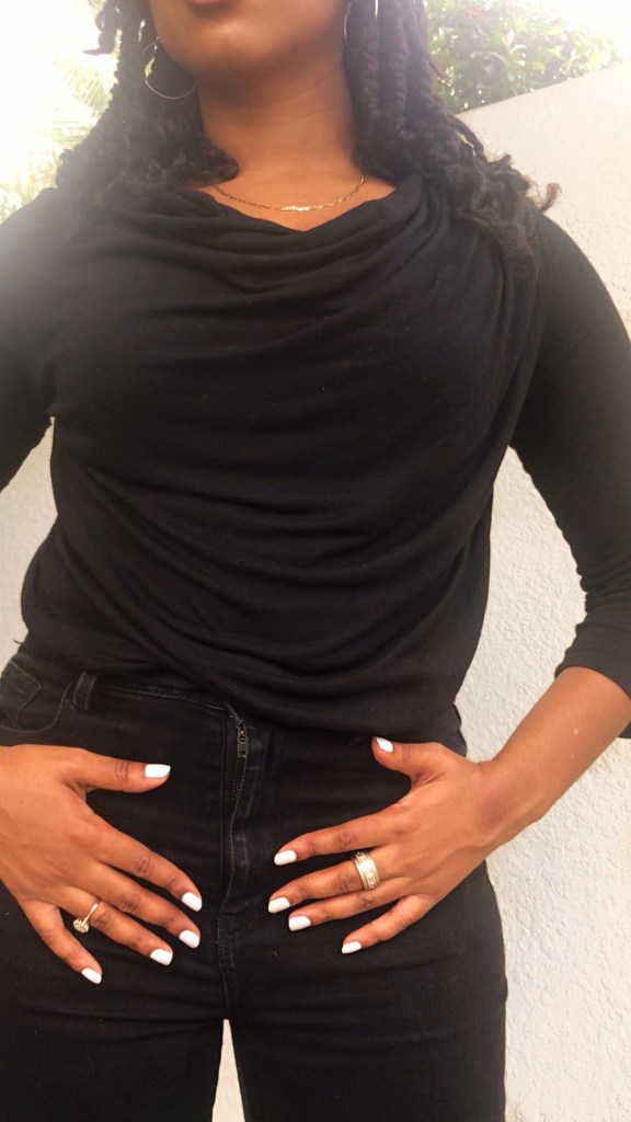 So here I have paired these black denim jeans from Forever 21 with a black shirt that has a layered neckline. The layered neckline is my favorite part of this outfit because it shows of your décolletage in a beautiful way. You can add a necklace for added decoration or not, since the layering is honestly beautiful enough.